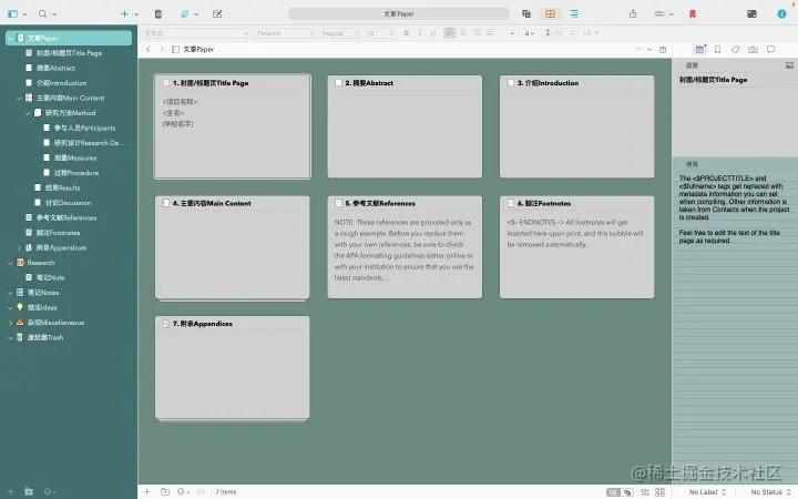 Scrivener 的核心特色便是其软木塞功能。你也可以将其视为卡片视图。通过软木塞功能,你可以对不同卡片进行拆分、合并、重组。这对于你调整文章结构、进行非线性写作非常有帮助。