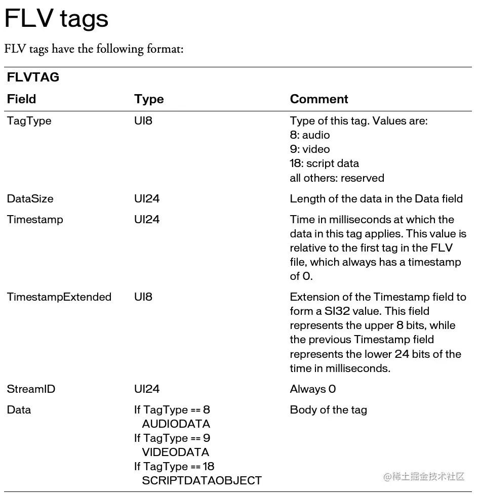 FLVBody就是由多个Previous TagSize和Tag组成,其中Previous TagSize占4个字节,而且第一个Previous TagSize的值为0。接下来我们看Tag的结构,Tag由Tag Header和Tag Data组成,其定义如下: