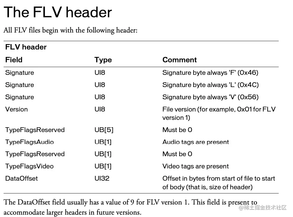 TypeFlagsAudio表示是否有音频,TypeFlagsVideo表示是否有视频 - 最后四个字节表示 FLVHeader的长度 固定是数字 9