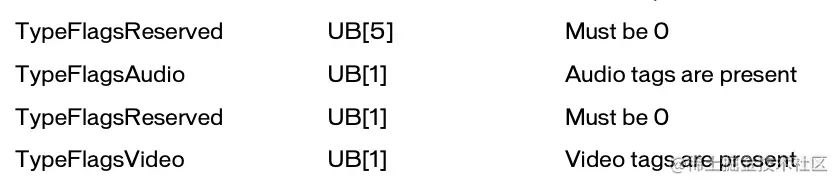 对上图做一些说明,Type列定义该字段的长度,UI8代表8位无符号整型,一个字节。UI32代表32位无符号整型,四个字节。UB[5]代表一个字节的5位,UB[1]代表一个字节的1位。