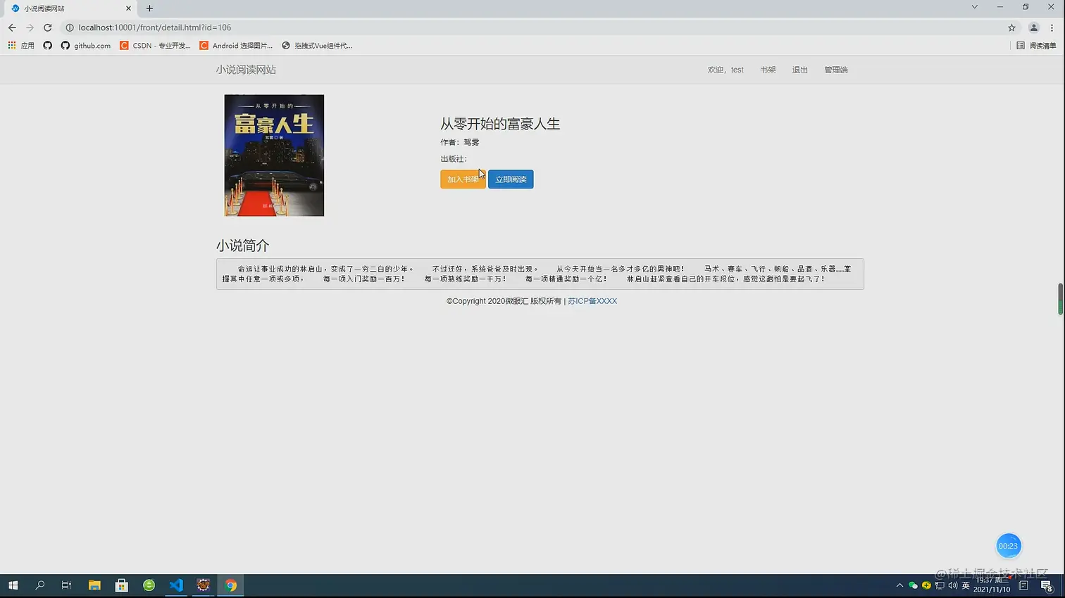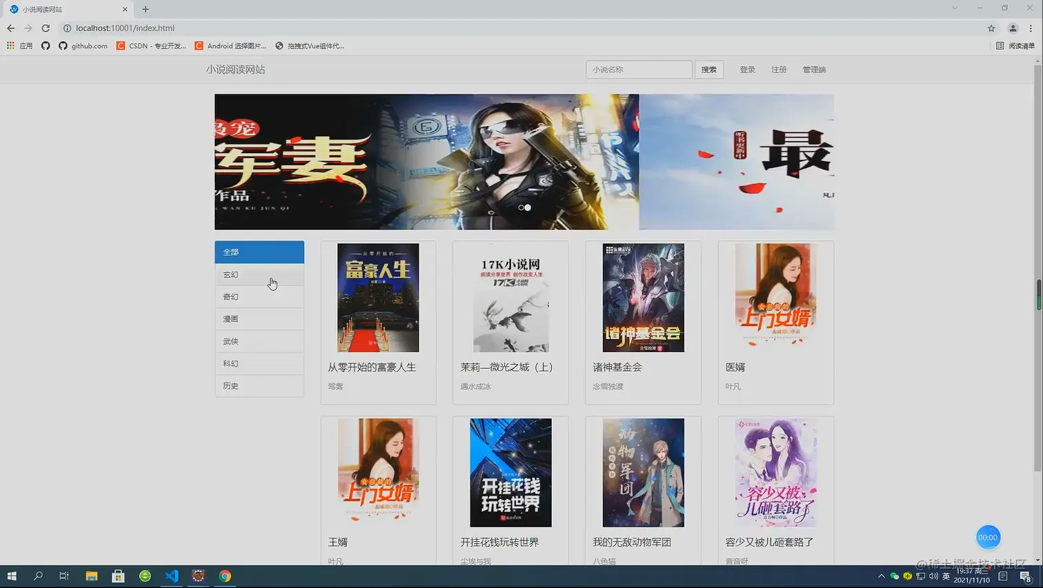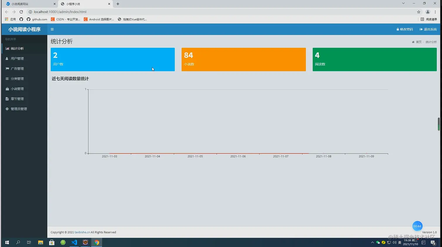 小说阅读包括两部分:前景和背景。前端功能五个模块:小说分类阅读、用户注册、在线留言、小说查询和章节阅读。后台包括八个模块:统计分析、用户管理、分类管理、小说管理、章节管理、消息管理和管理员管理。