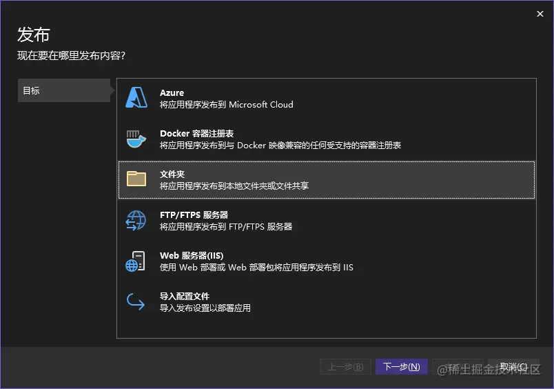 选择发布到文件夹,然后选中刚才克隆的仓库然后点击完成