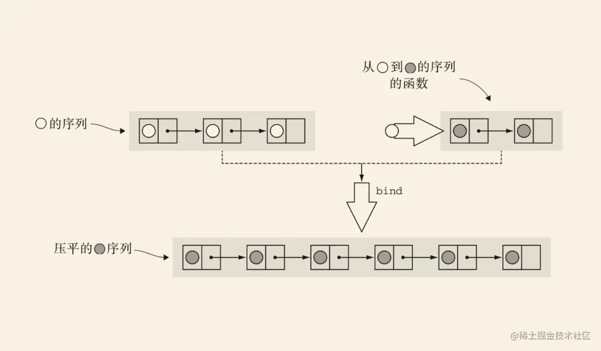 上述代码就是一个最基本的 Monad,它将程序的多个步骤抽离成线性的流,通过 bind 方法对数据流进行加工处理,最终得到我们想要的结果。