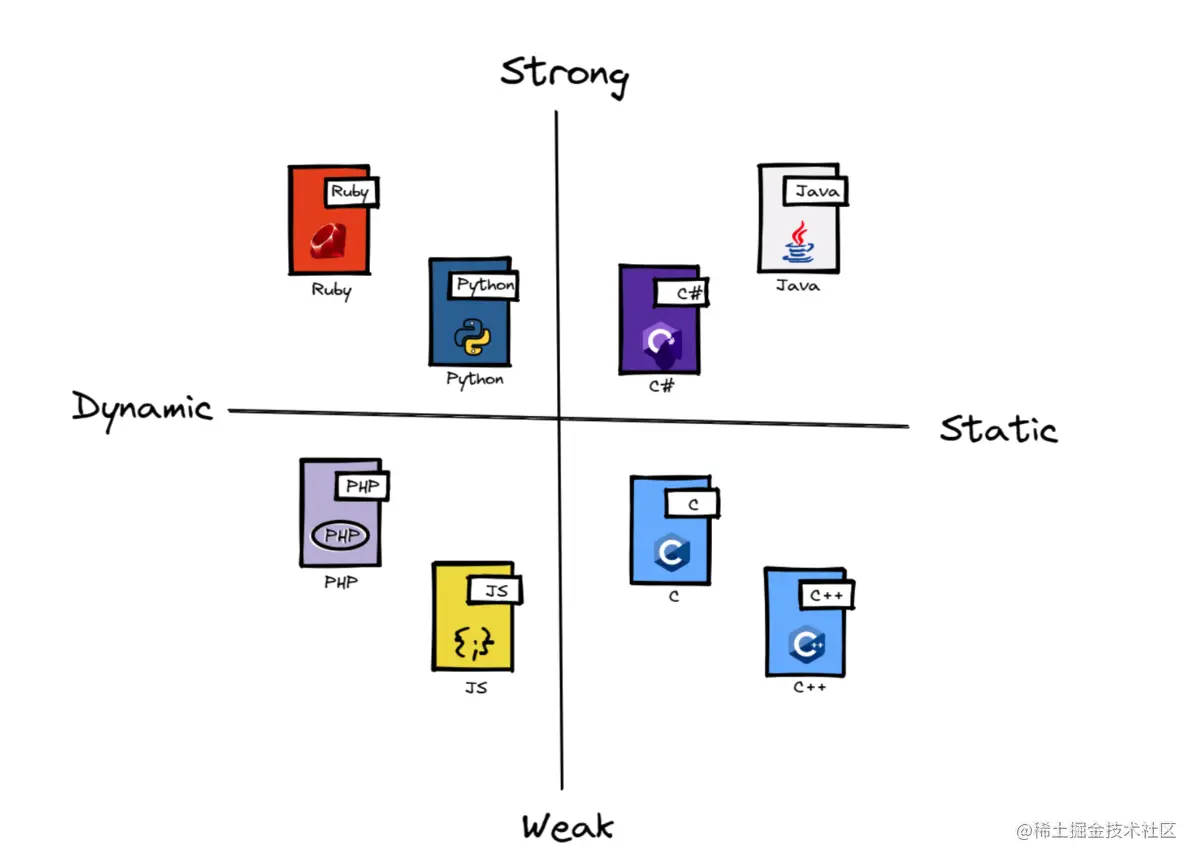 我总结了一个常见编程语言类型的分类图,注意拆分的四个区域是分区,比如PHP和JS都是动态弱类型。