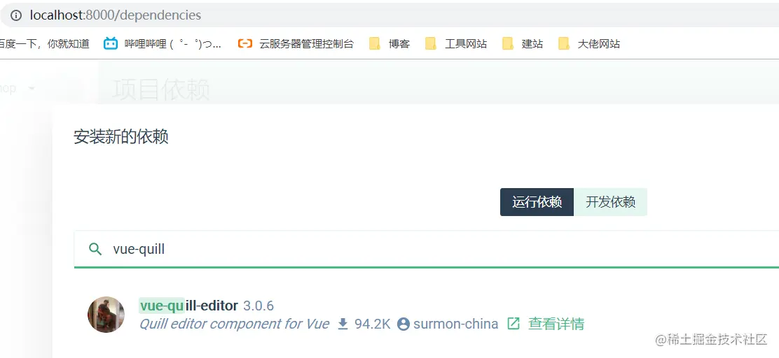 - 使用vue ui,在ui界面直接搜索依赖 vue-quill-editor