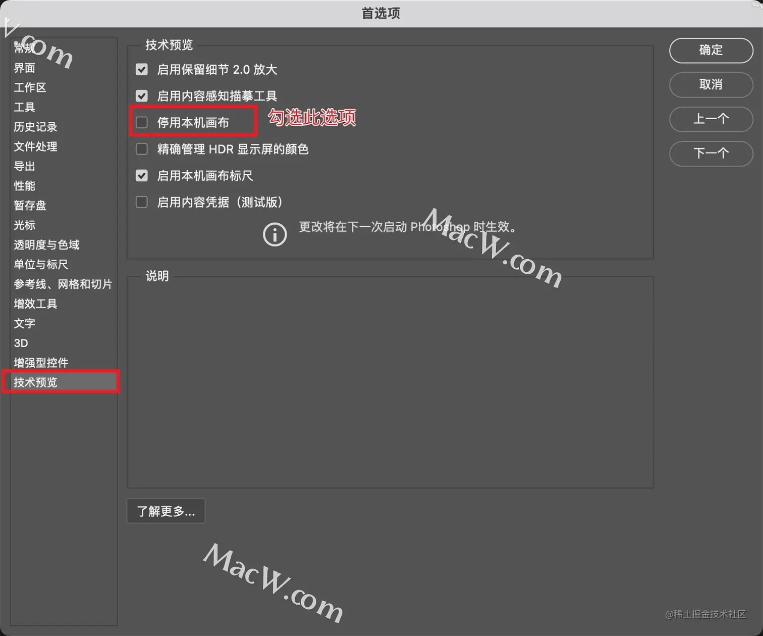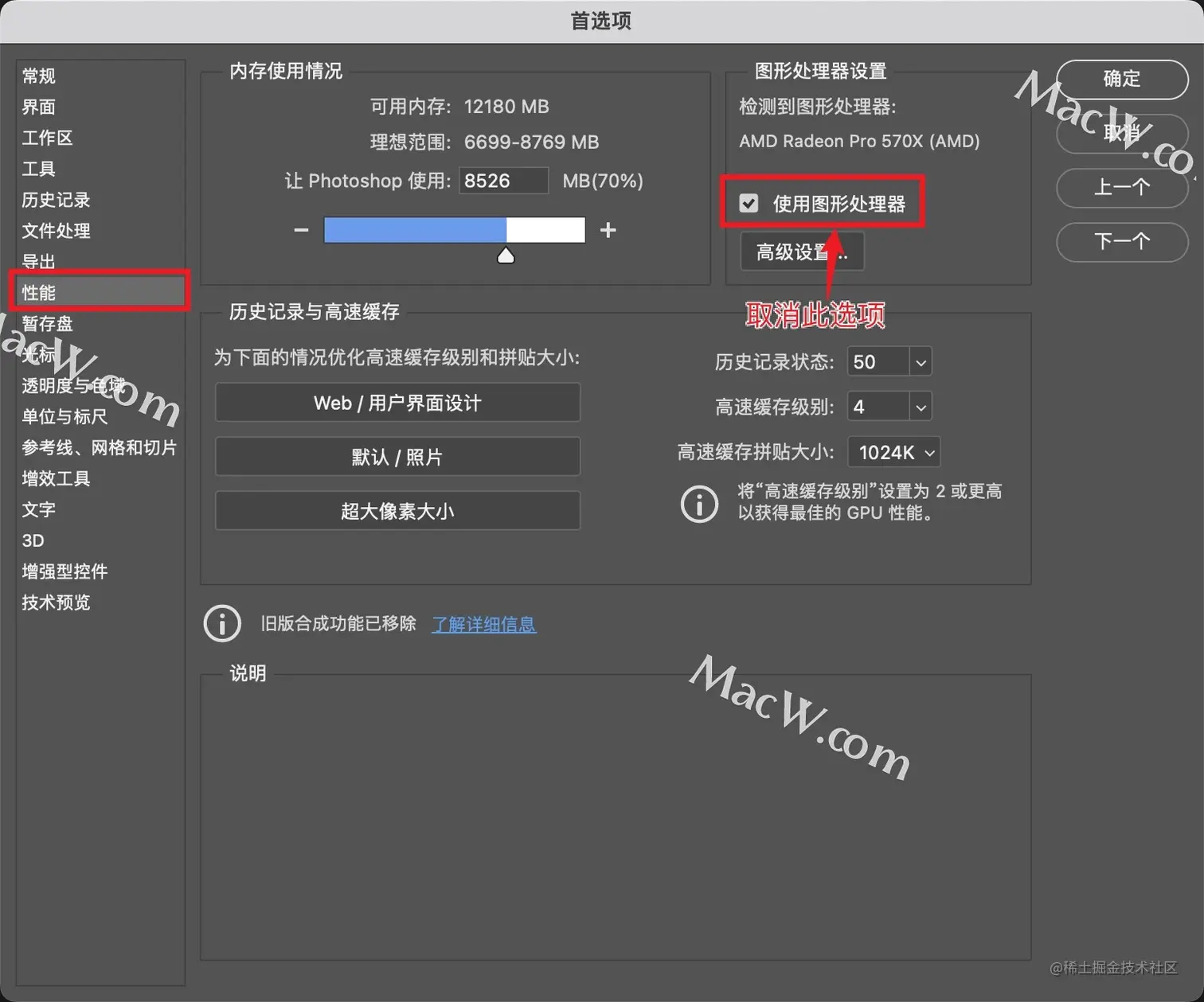 【PS常见问题】解决PhotoShop for Mac打开文件绿屏的问题 macwbear飞 2022-07-02 286 阅读1分钟 MacBook用户是否遇到过用photoshop打开文件绿屏的情况?如何解决PS绿屏问题? 解决方法 1、打开PS首选项,技术预览中在停用本机画布前面打勾,如下图: 2、然后,切换到性能页面,取消勾选使用图形处理器 3、重启PS 重启后,再使用PhotoShop打开文件,就不会有绿屏显示了,可以正常操作了。 以上就是PhotoShop for Mac打开文件绿屏的解决方法了,遇到此问题的用户可以去试试啦!