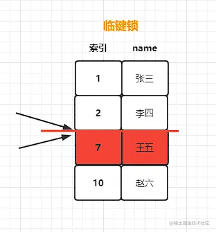 临键锁适用于非唯一性索引,且仅在可重复读级别下生效。和间隙锁不同的是,临键锁是SQL命中了部分记录的场景,除了会锁定间隙外还会锁定命中记录的下一个区间,是一个左开右闭的模式。