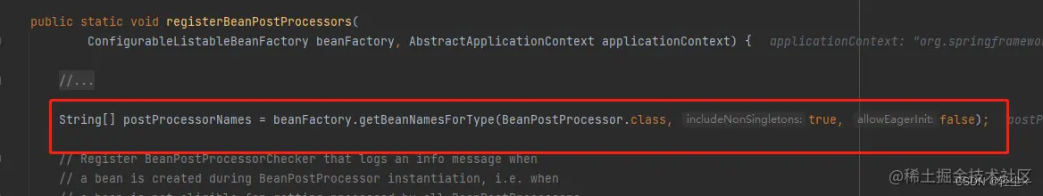 进去 registerBeanPostProcessors后,一上来就是getBeanNamesForType,把类型是BeanPostProcessor.class的bean的名称都从容器获取出来
