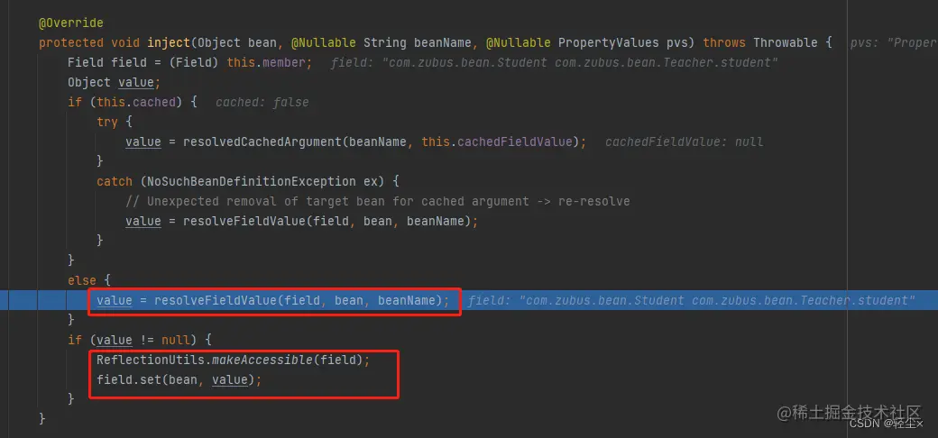 然后通过反射方式field.set(bean, value)将student设置给Teacher对象,完成了我们的注入