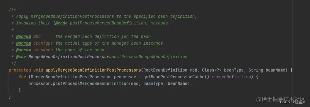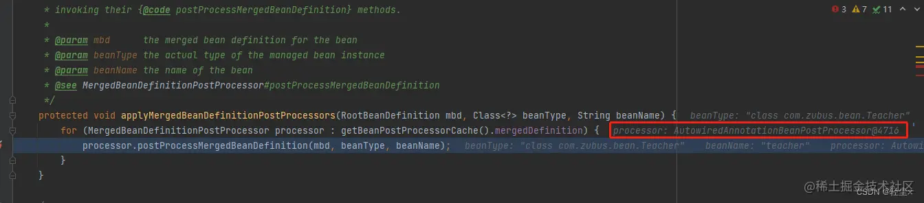 我们可看到,这里循环调用的执行的是 MergedBeanDefinitionPostProcessor,咋一看这和我们的主角AutowiredAnnotationBeanPostProcessor毫无关系,怎么就会执行呢