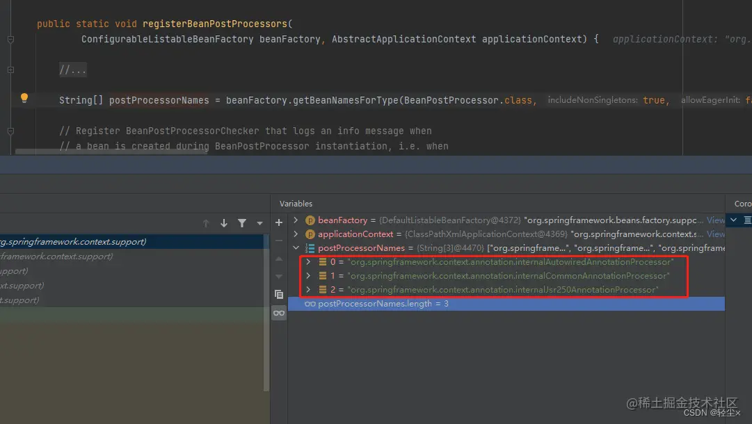 可以看到postProcessorNames有三个元素,internalAutowiredAnnotationProcessor赫然在列