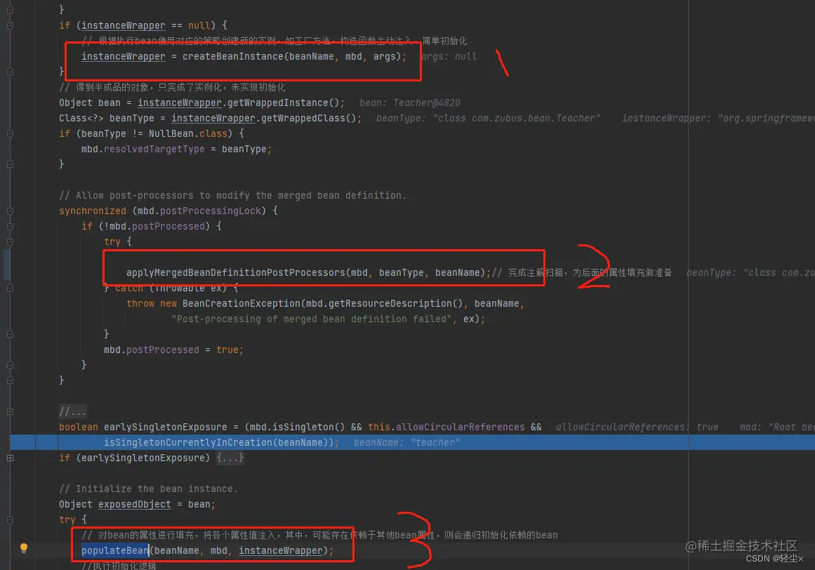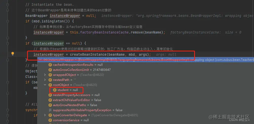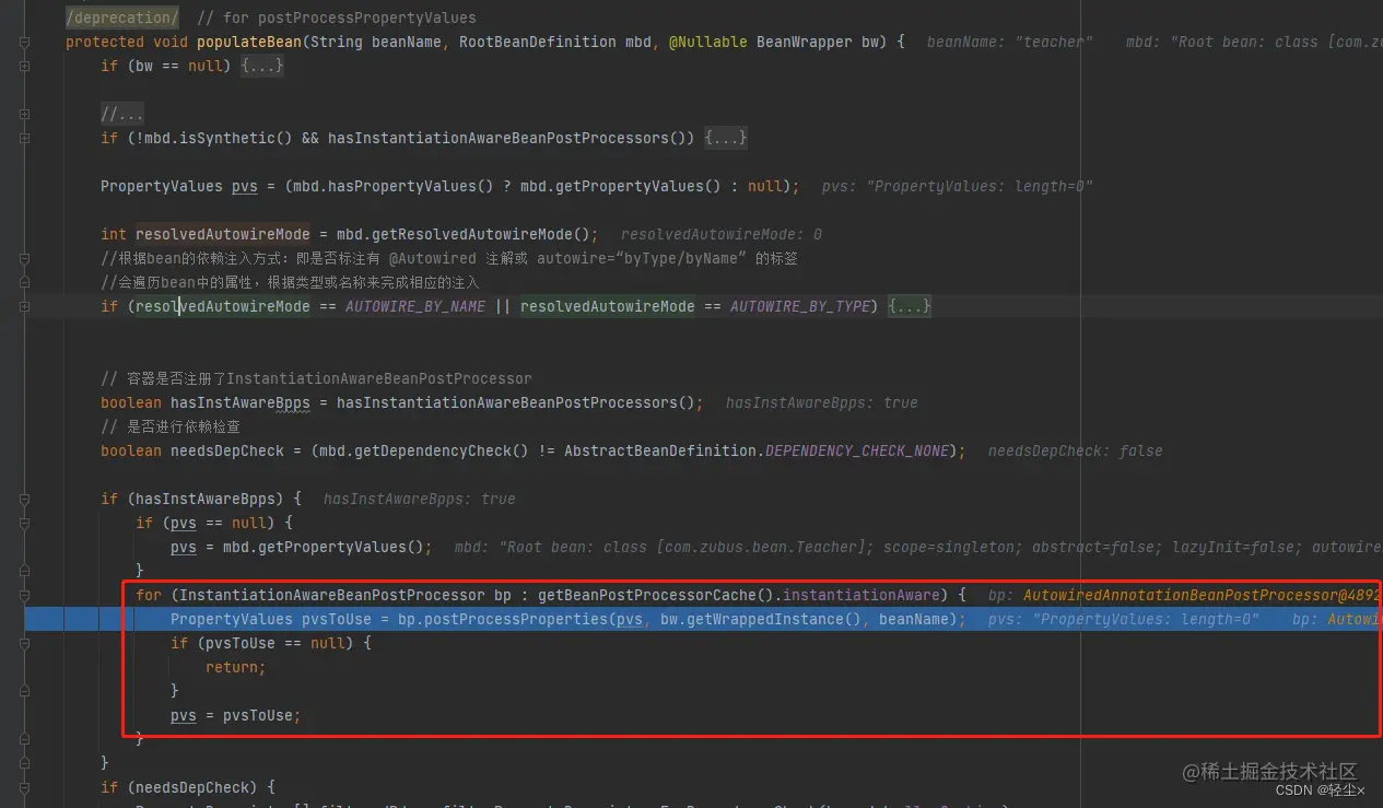 在完成与解析之后,我们的Teacher对象还只是完成了实例化,还没有完成初始化,需要调用populateBean 进行属性的填充,@Autowired真正的解析就发生在这里