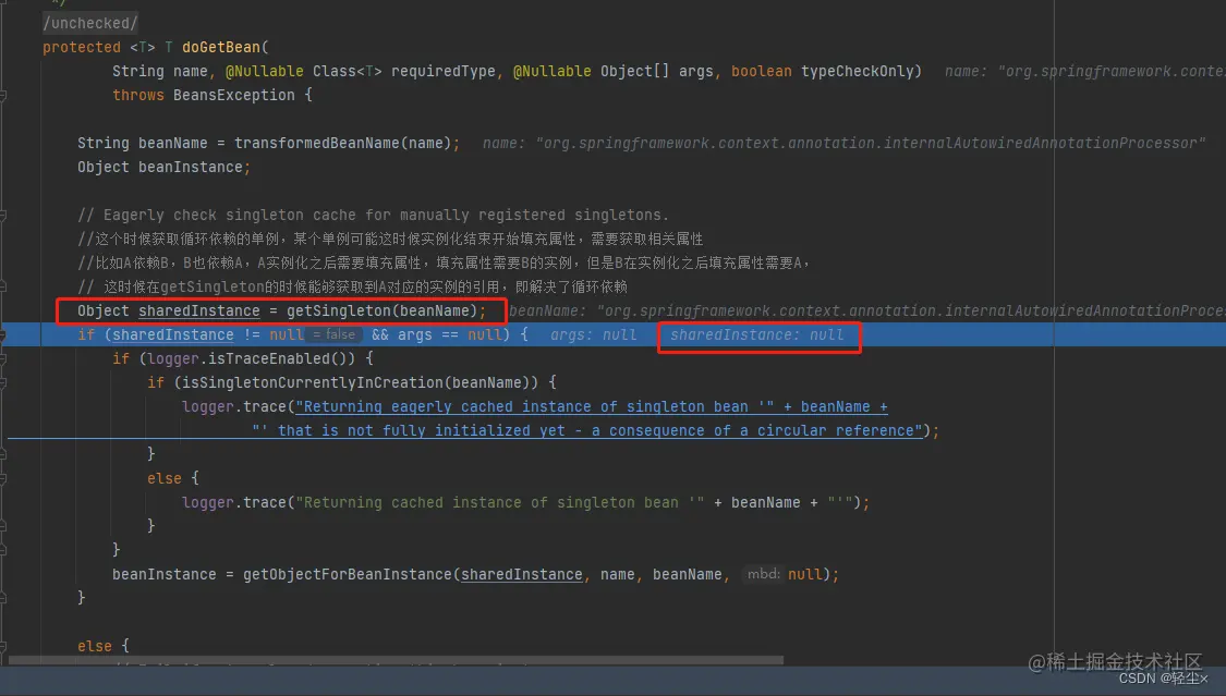 所以能顺理成章的进入getBean环节,后面的就是熟悉的流程了,getBean调用doGetBean,doGetBean会先调用getSingleton(beanName)在容器中找一下,找到就返回,这里肯定是没有的