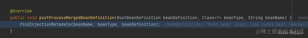 值此“半成品”之际,applyMergedBeanDefinitionPostProcessors(mbd, beanType, beanName)被执行,FactoryBean里面实现了MergedBeanDefinitionPostProcessor的BeanPostProcessor有多个,我们只关心AutowiredAnnotationBeanPostProcessor这个