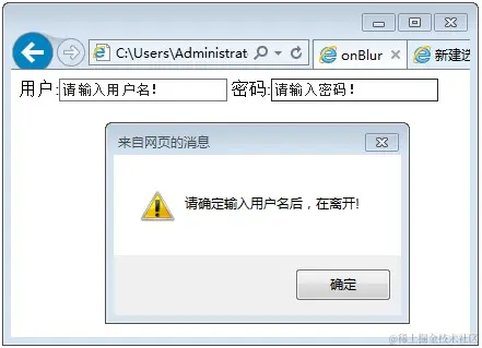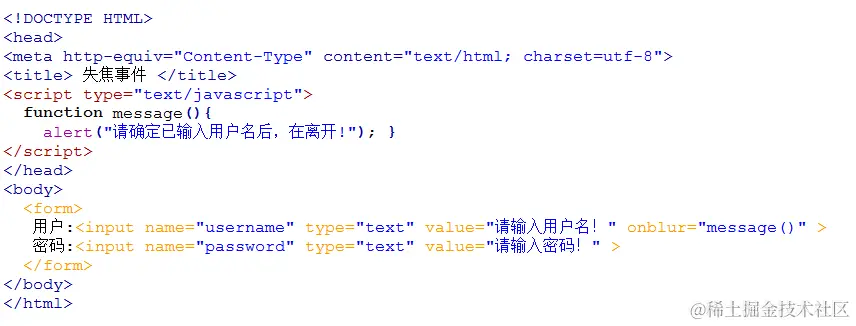 如下代码, 网页中有用户和密码两个文本框。当前光标在用户文本框内时(即焦点在文本框),在光标离开该文本框后(即失焦时),触发onblur事件,并调用函数message()。