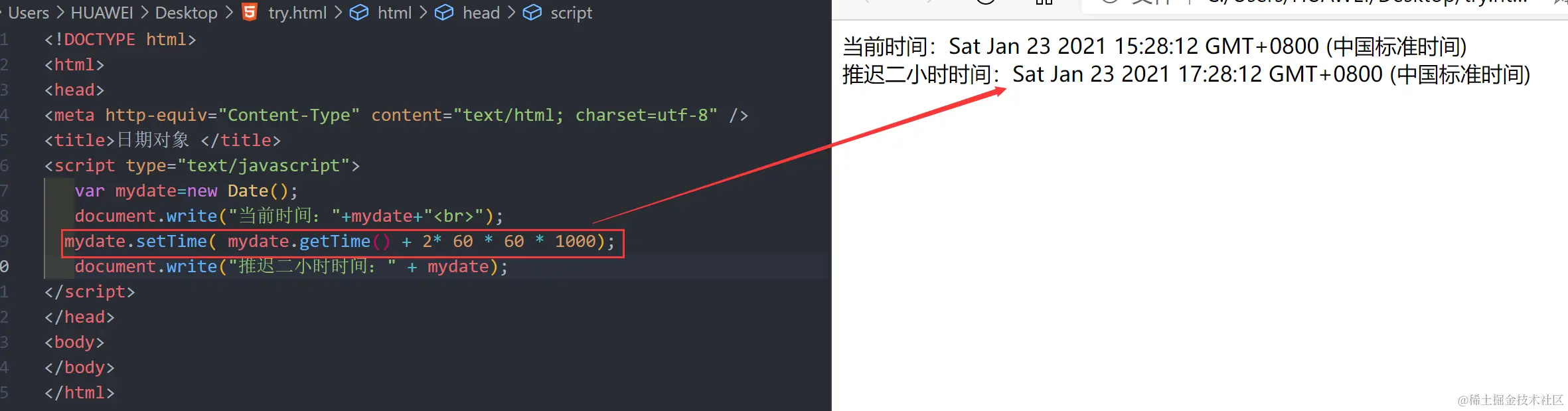 document.write("推迟一小时时间:" + mydate);