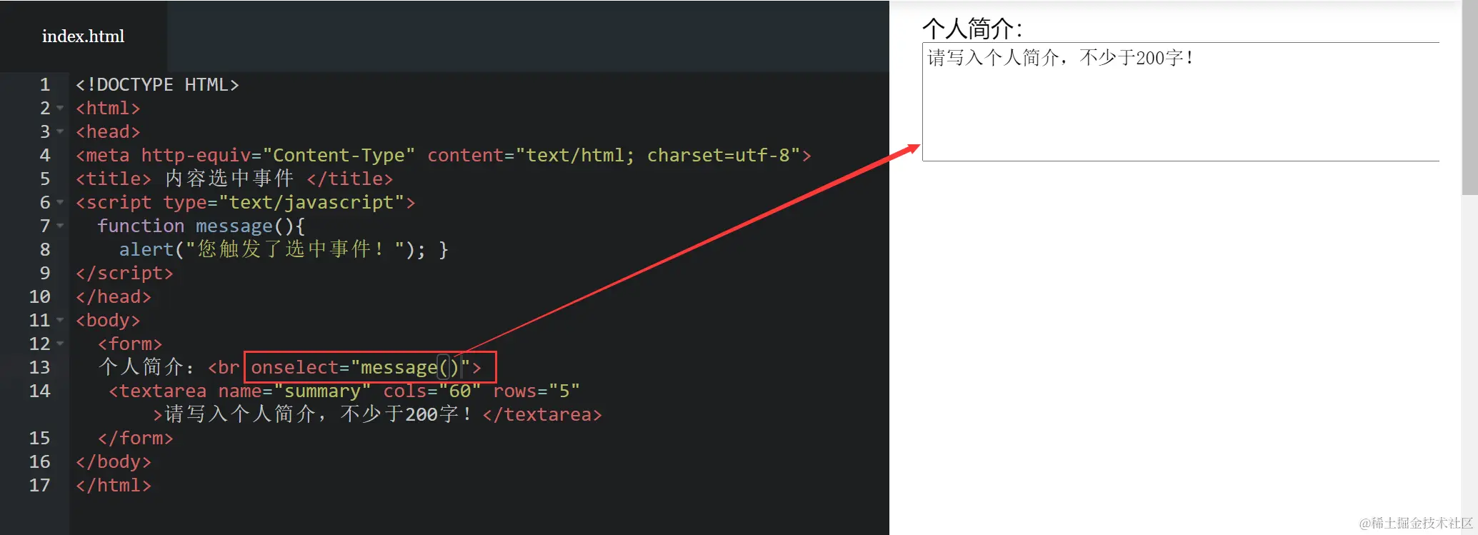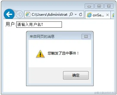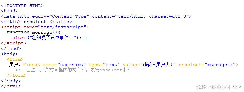 如下代码,当选中用户文本框内的文字时,触发onselect 事件,并调用函数message()。