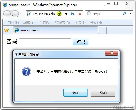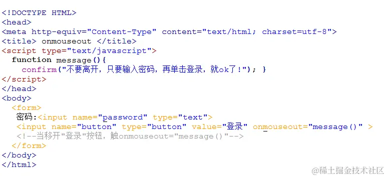 当把鼠标移动到"登录"按钮上,然后再移开时,触发onmouseout事件,调用函数message(),代码如下: