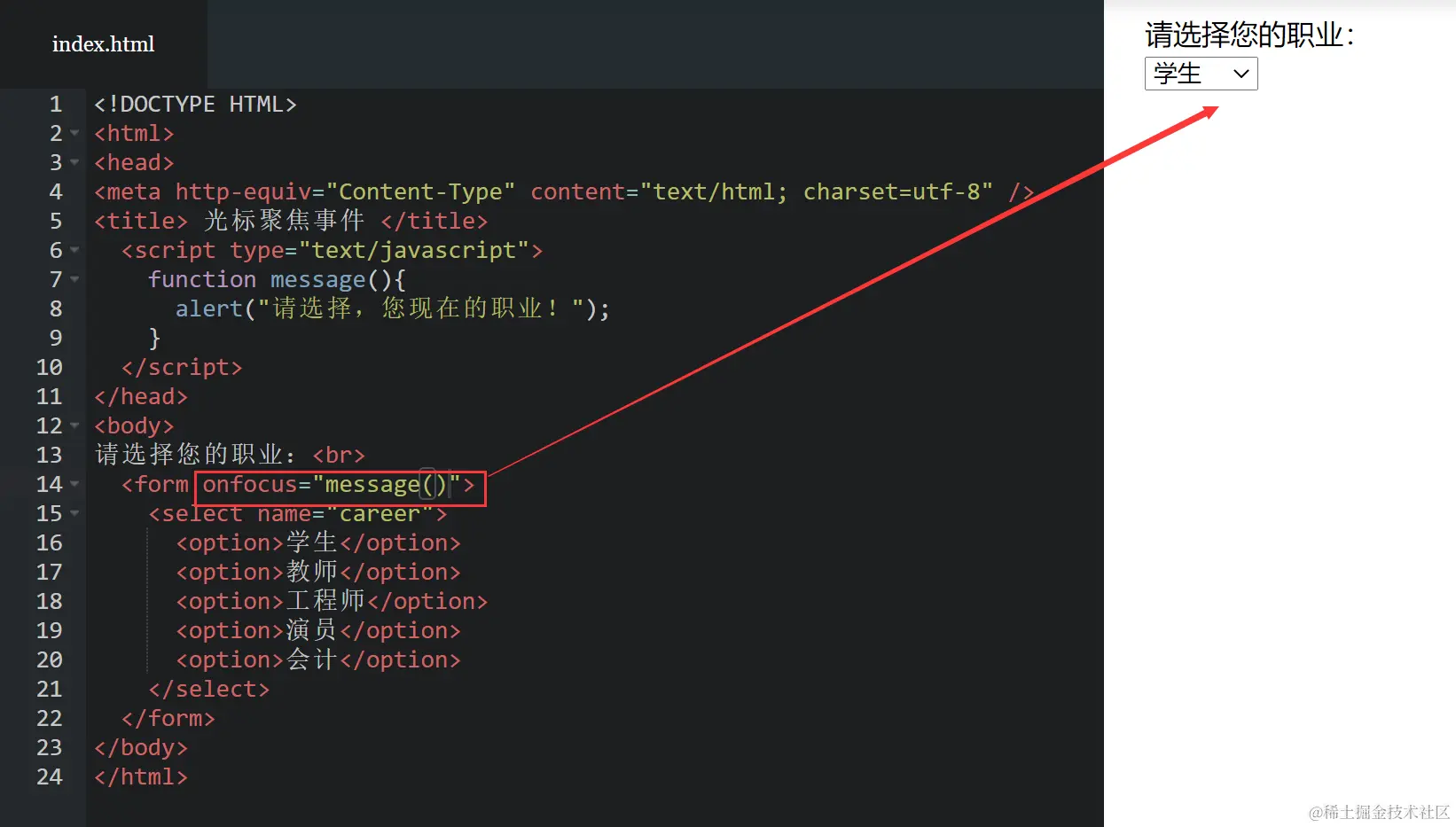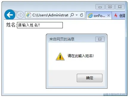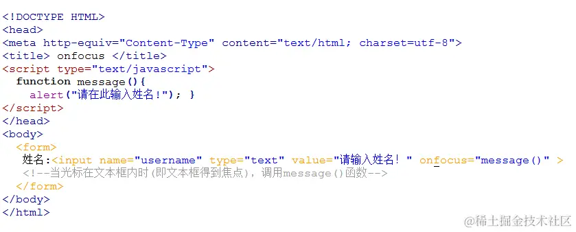 如下代码, 当将光标移到文本框内时,即焦点在文本框内,触发onfocus 事件,并调用函数message()。