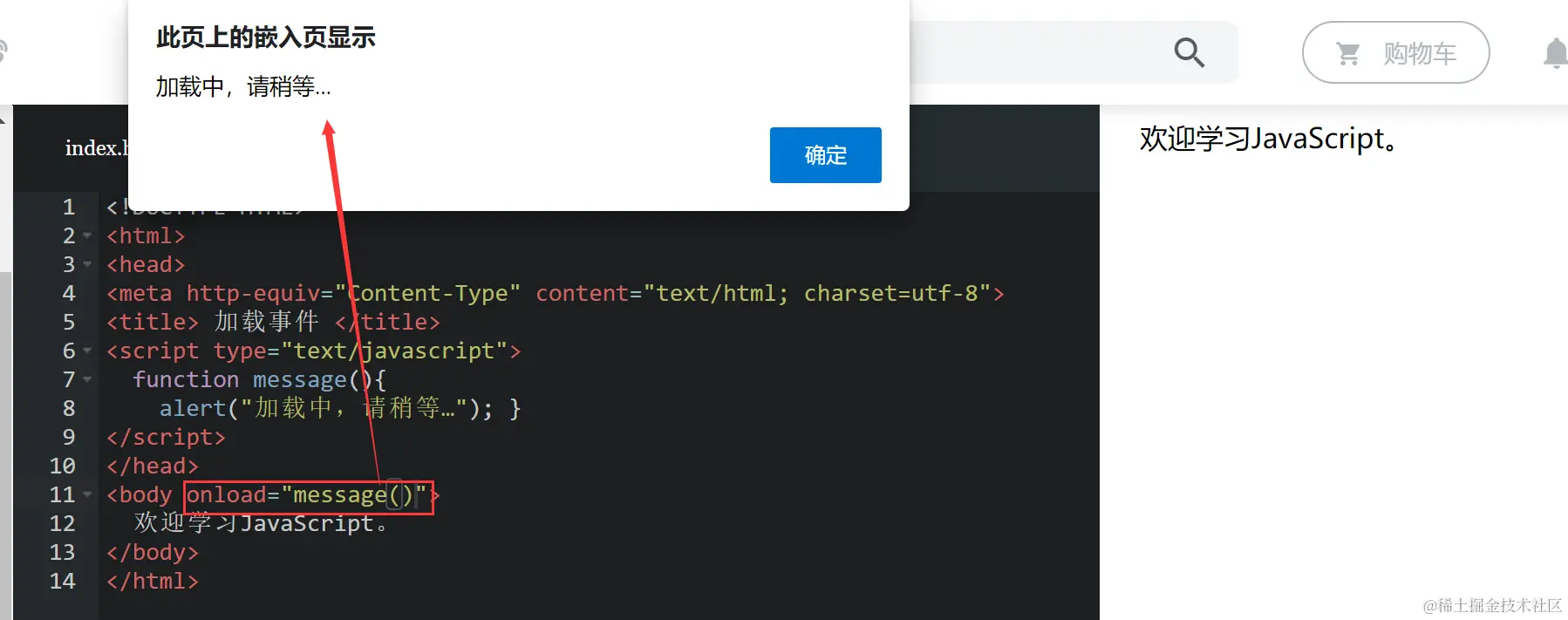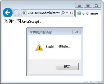 - 此节的加载页面,可理解为打开一个新页面时。 如下代码,当加载一个新页面时,弹出对话框“加载中,请稍等…”。