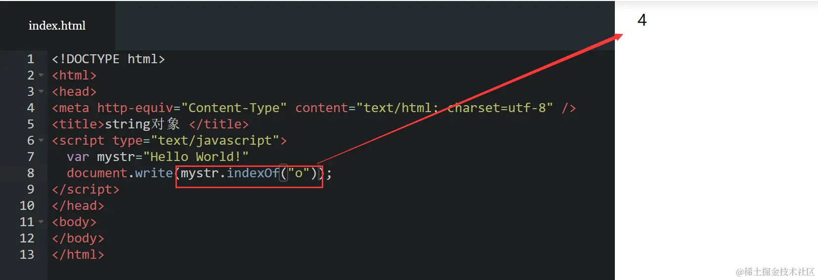 3.如果找到一个 substring,则返回 substring 的第一次出现的位置。stringObject 中的字符位置是从 0 开始的。