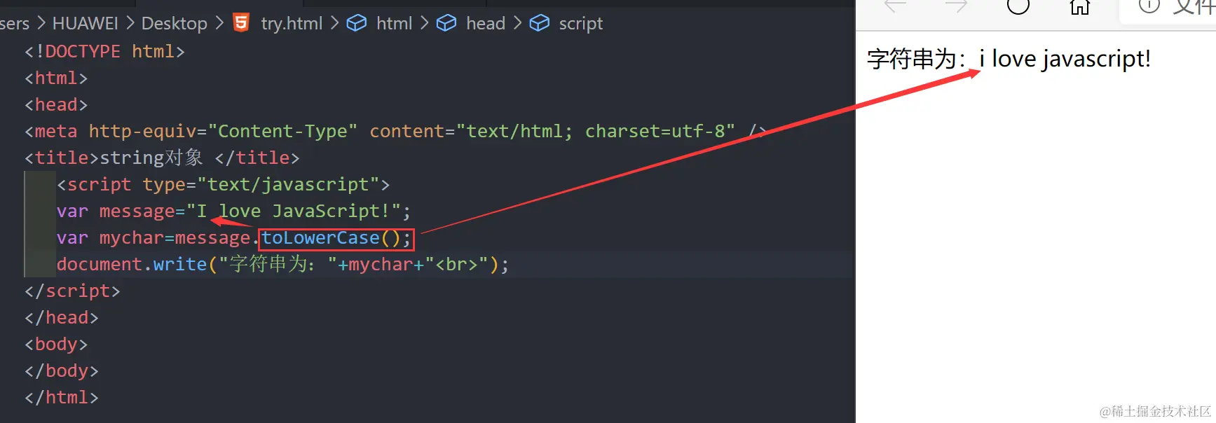 如使用string 对象的 toUpperCase() 方法来将文本转换为大写: