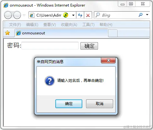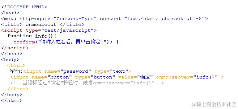 现实鼠标经过"确定"按钮时,触发onmouseover事件,调用函数info(),弹出消息框,代码如下: