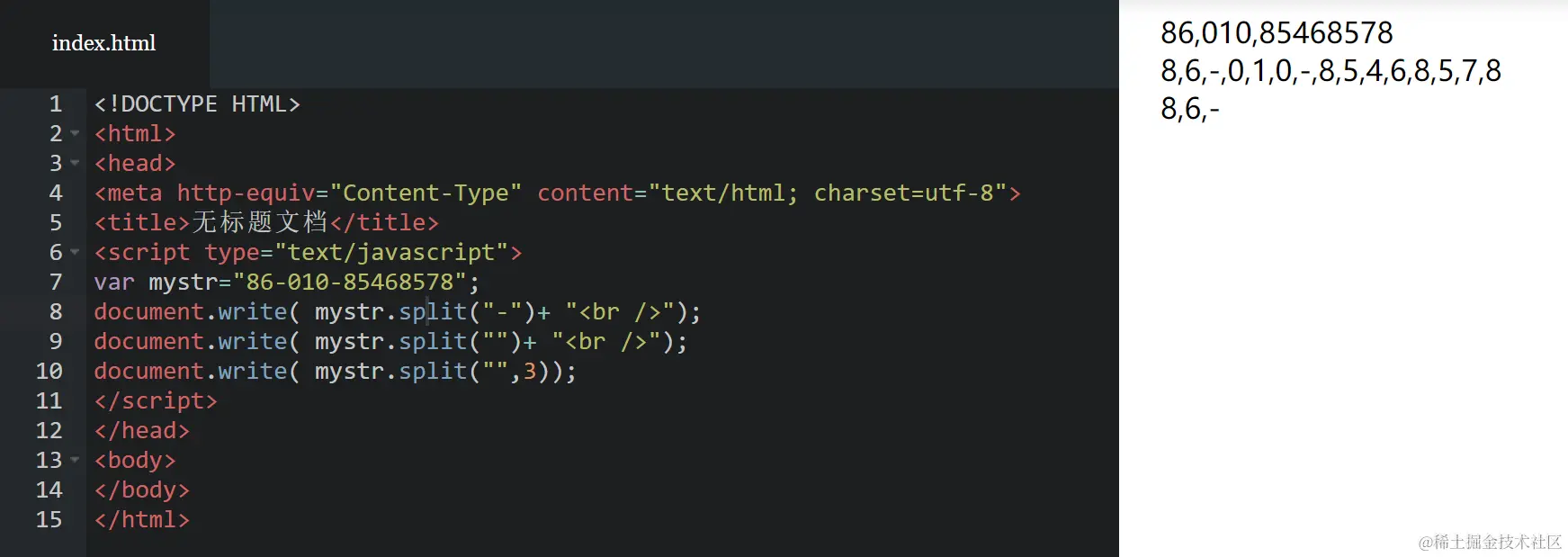split() 方法将字符串分割为字符串数组,并返回此数组。