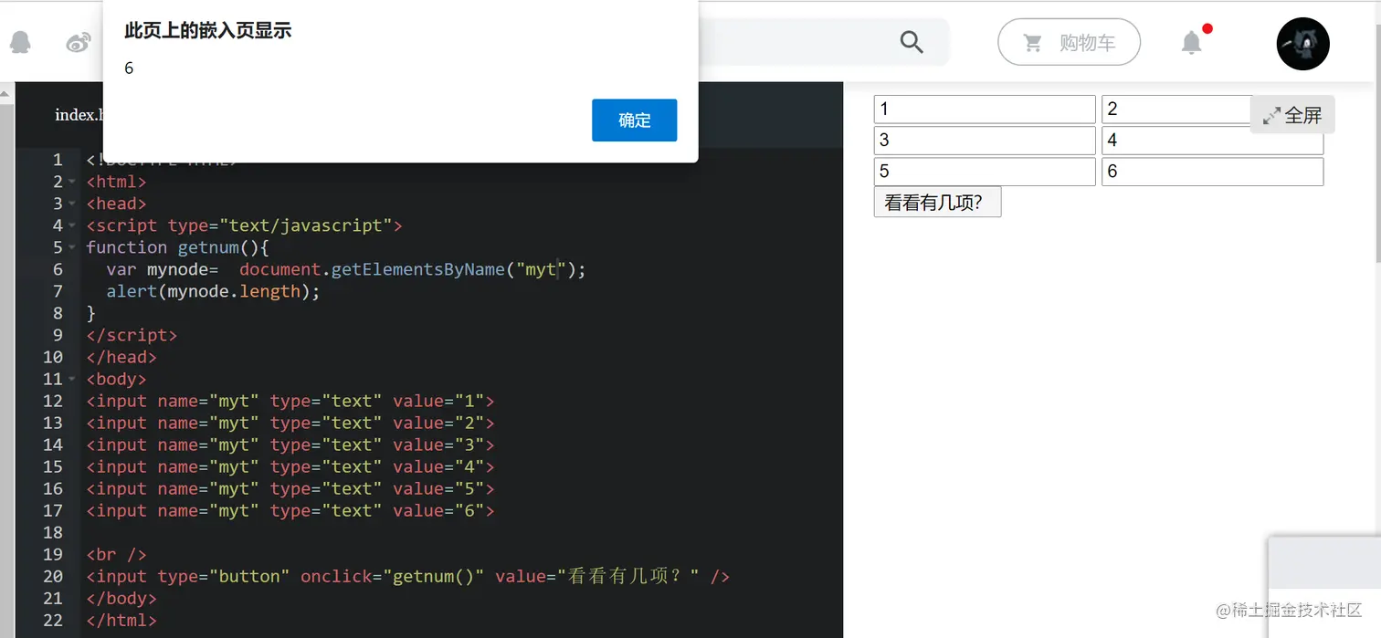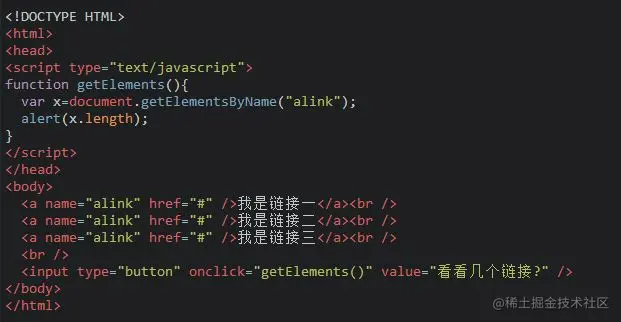 - 因为文档中的 name 属性可能不唯一,所有 getElementsByName() 方法返回的是元素的数组,而不是一个元素。