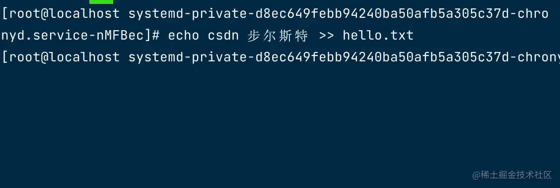 echo i love u CSDN 步尔斯特 >> hello.txt,观察容器内是否有输出