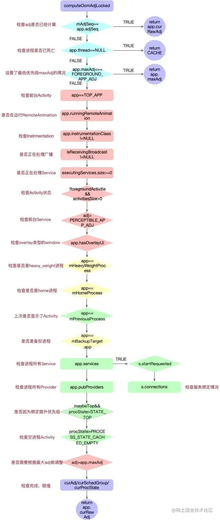 adj、schedGroup、procState和adjType的核心计算步骤是在AMS中的computeOomAdjLocked方法完成的,如图: