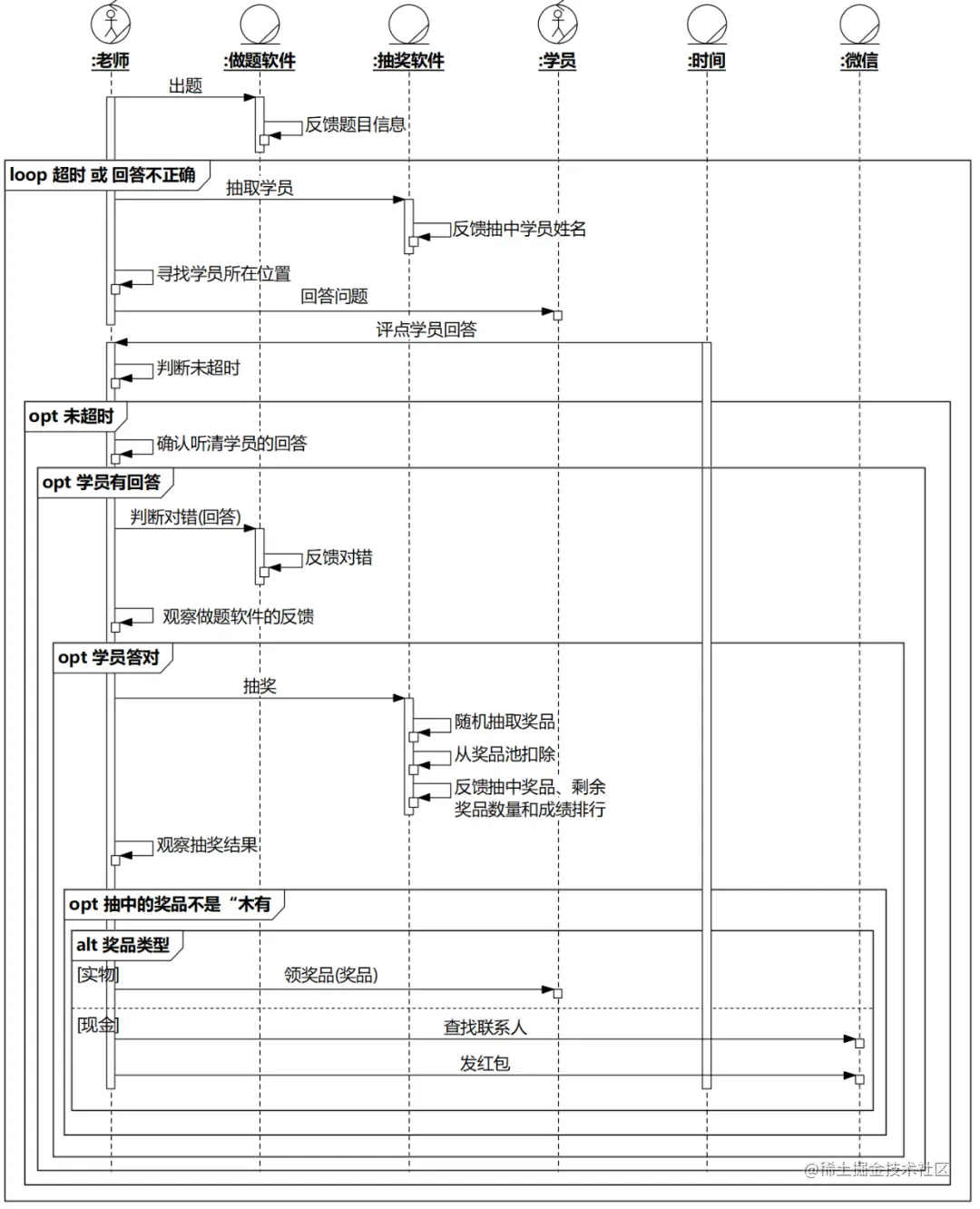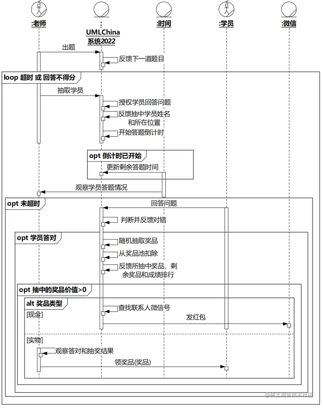 案例一是写书时正在关注的另一个UMLChina流程:上课时做题并抽奖,涉及到考试和抽奖的领域知识。