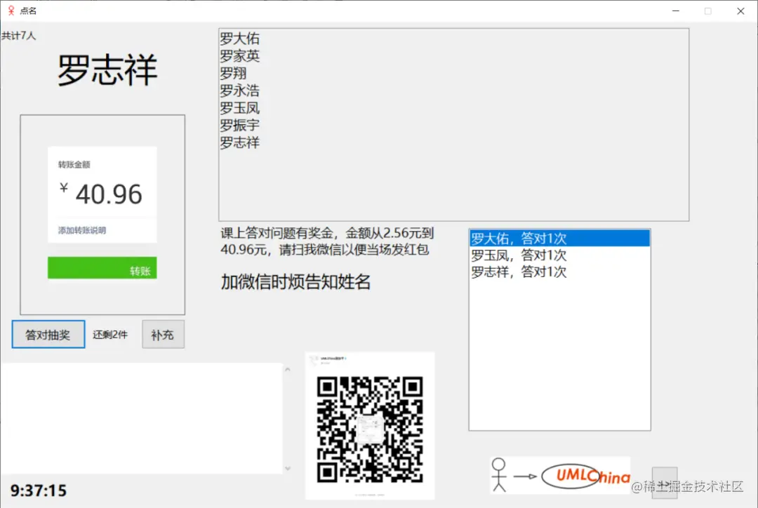 UMLChina的训练中,老师每讲解一个知识点,就会用一个做题软件让学员做一些的题目,考查学员是否掌握。这些题目由老师在课前设置好。为了提高学员做题的兴趣,老师会用一个抽奖软件为答对题目的学员抽奖。