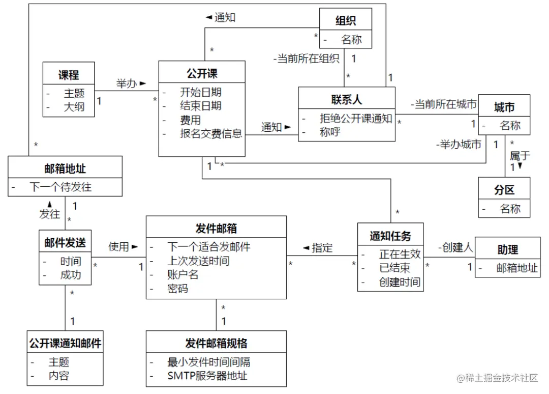 《软件方法(上)》以及下册2018年发布的电子版本,使用的案例是“UMLChina系统2018”。案例中讨论了给特定分区的联系人发公开课通知邮件的领域逻辑,类图如图9-1。