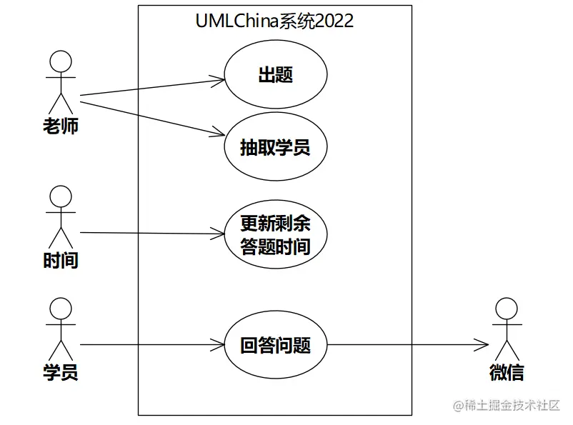 注意,引进的系统依然叫“UMLChina系统”,并非“UMLChina答题抽奖系统”。“答题抽奖”可以看作由若干用例组成的用例集。