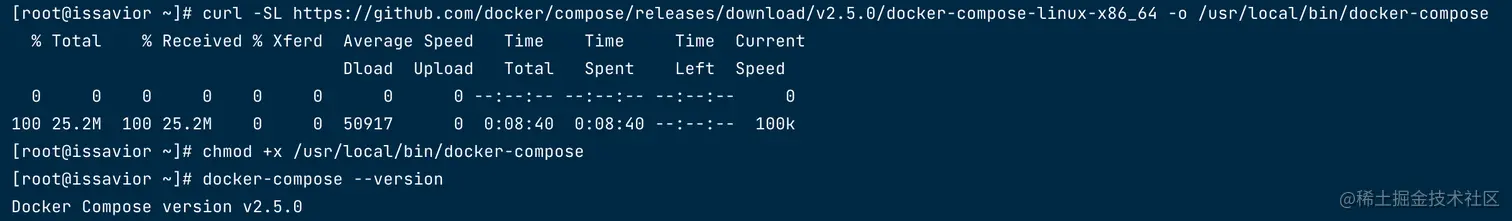 curl -SL https://github.com/docker/compose/releases/download/v2.5.0/docker-compose-linux-x86_64 -o /usr/local/bin/docker-compose - 对二进制文件应用可执行权限: