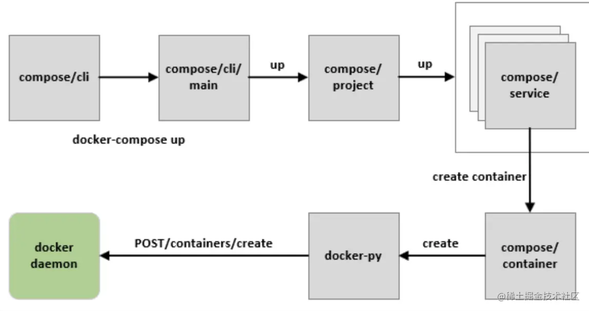 注意,这里的 project, service 和 container 对应的都是 docker-compose 实现中的数据结构。下面让我们结合上图来介绍 docker-compose 工作的大致流程。