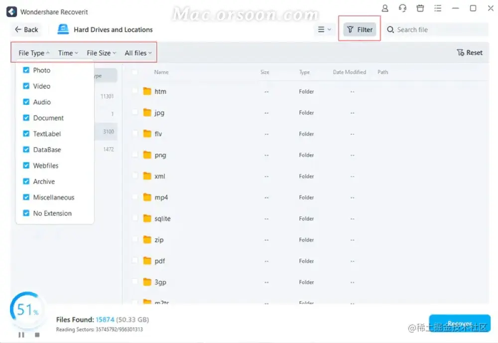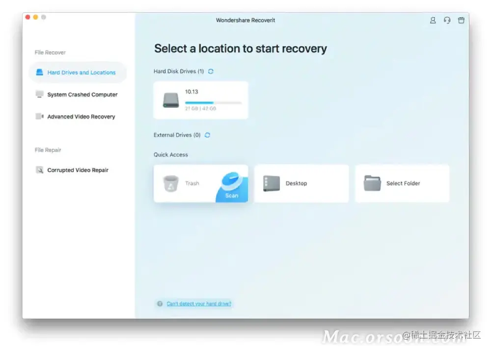 每次临时删除文件时,它都会移动到 Mac 的垃圾箱。您通常可以在之后前往 Mac 废纸篓进行恢复。但是,如果您永久删除文件或清空垃圾箱,万兴恢复专家将成为您取回文件的必备工具。Mac Trash 上的数据可能来自不同的扇区、分区、硬盘驱动器甚至 Mac 上连接的外部设备。因此,扫描所有数据类型的 Mac 垃圾箱将需要大量时间并给您的 Mac 带来一些负担。为了解决这个问题,万兴恢复专家提供了 2 种恢复模式,即全面恢复和深度恢复。全能恢复模式是扫描垃圾桶中一些常用的文件,而深度恢复模式可以进行深度扫描,甚至挖出系统文件。