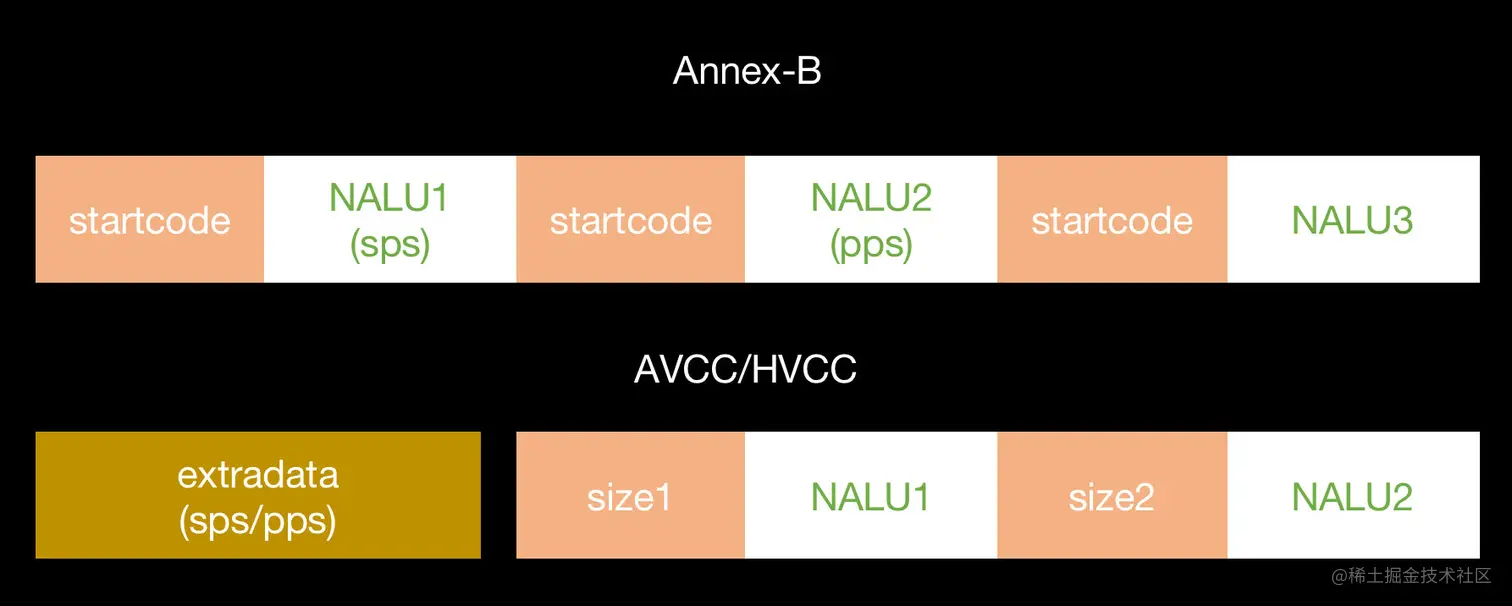 - AVCC/HVCC:参数集特殊处理,放在头部被称为extradata的数据中。
