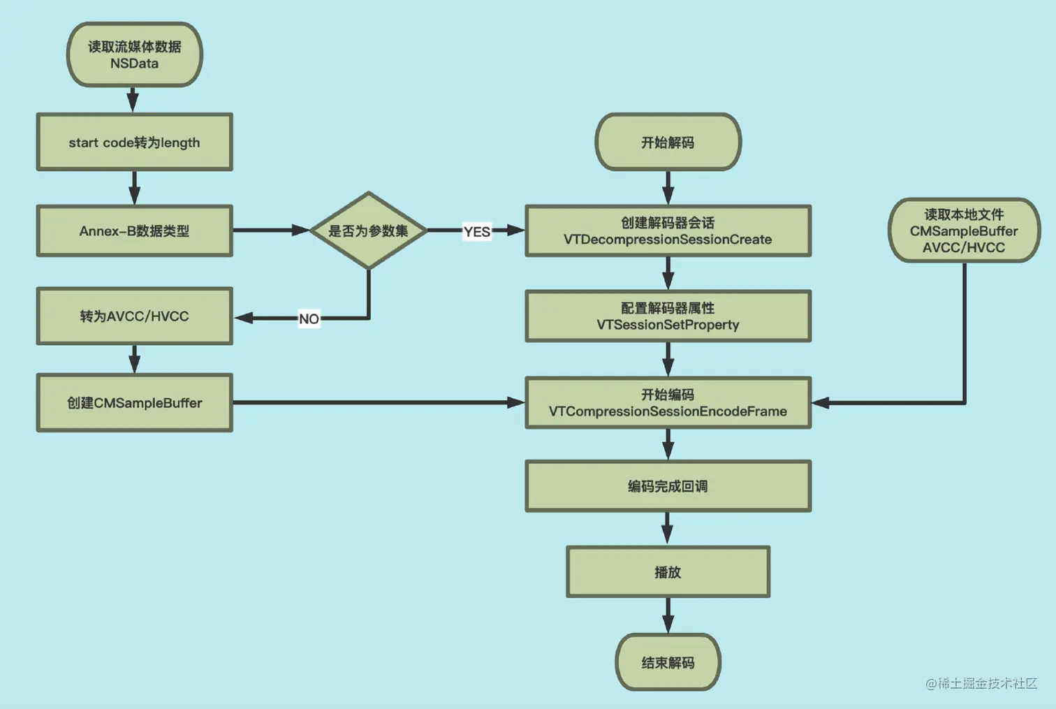 格式转换过程与编码正好相反:将start code 转为4字节的NALU长度;判断数据类型,如果是参数集则存储用于初始化解码器,如果是帧数据则进行解码。