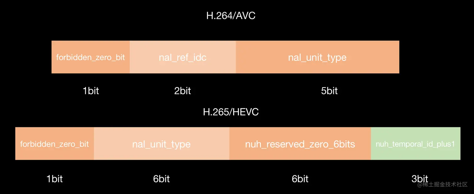 NAL Header包含当前NALU的类型(nal_unit_type)信息,H.264的NAL Header为一个字节,H.265为两个字节,所以获取类型的方法不同: