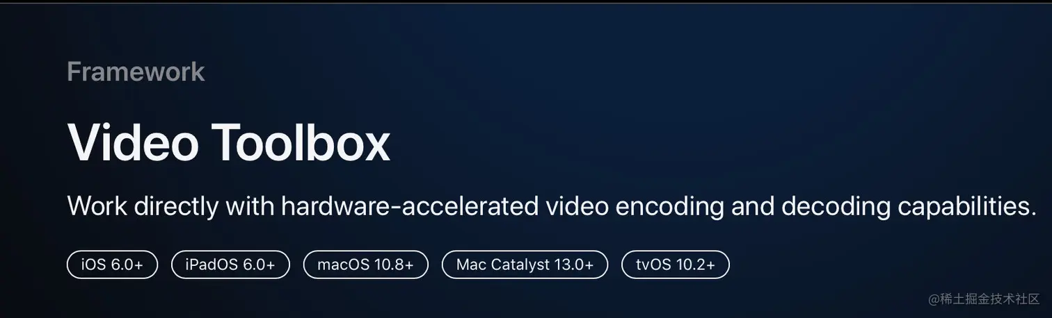 Video Toolbox 最早是在OS X上运行,现在看苹果的官方文档的说明,Video Toolbox 的系统支持为iOS 6.0+,实际上苹果在WWDC2014大会上才开放了Video Toolbox框架,即iOS 8.0以后开发者才可以使用。