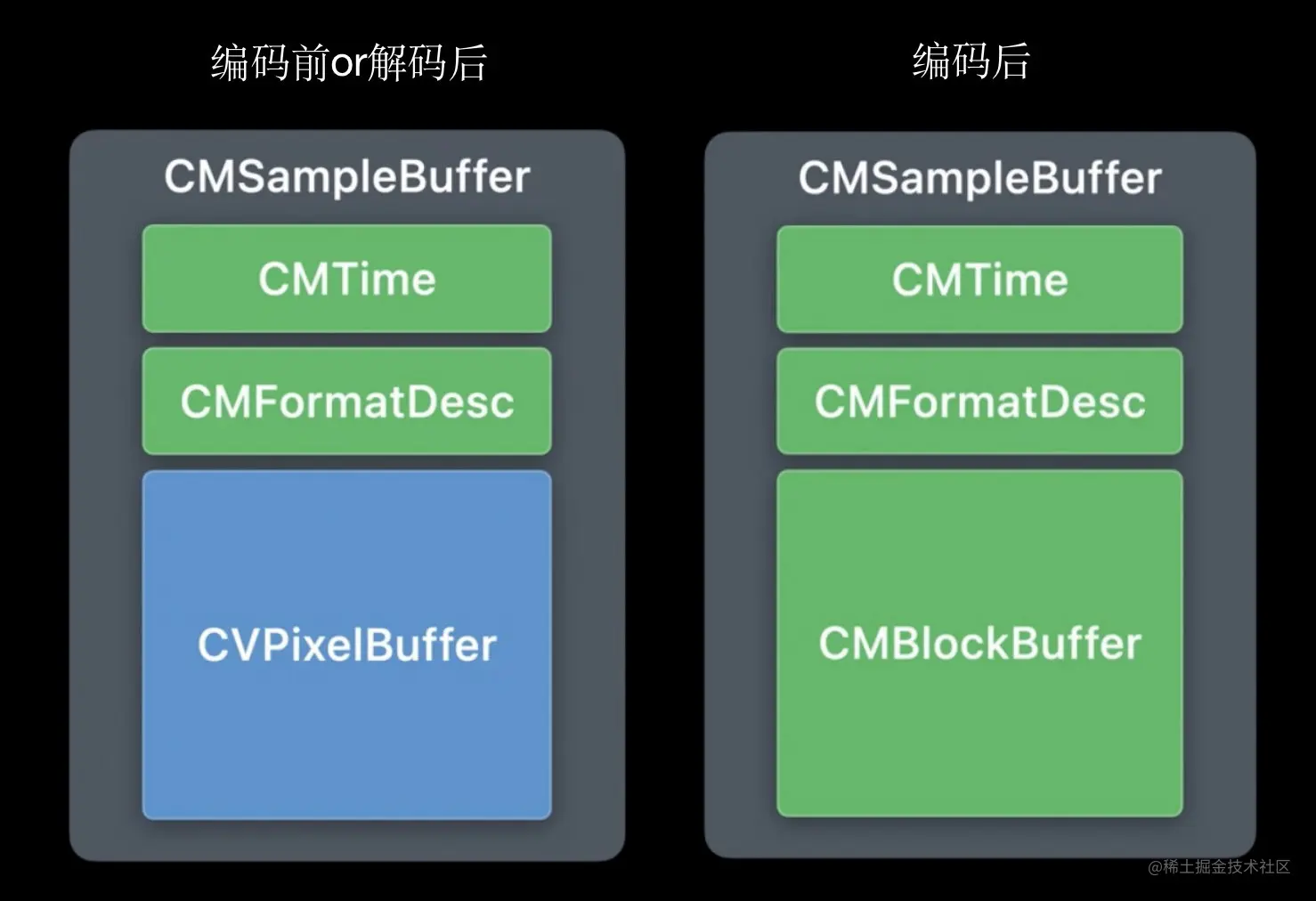 其中,视频解码输出的回调参数outputCallback类型为typedef void (*VTCompressionOutputCallback)(void *outputCallbackRefCon, void *sourceFrameRefCon, OSStatus status, VTEncodeInfoFlags infoFlags, CMSampleBufferRef sampleBuffer),"sampleBuffer"即为编码后的数据。