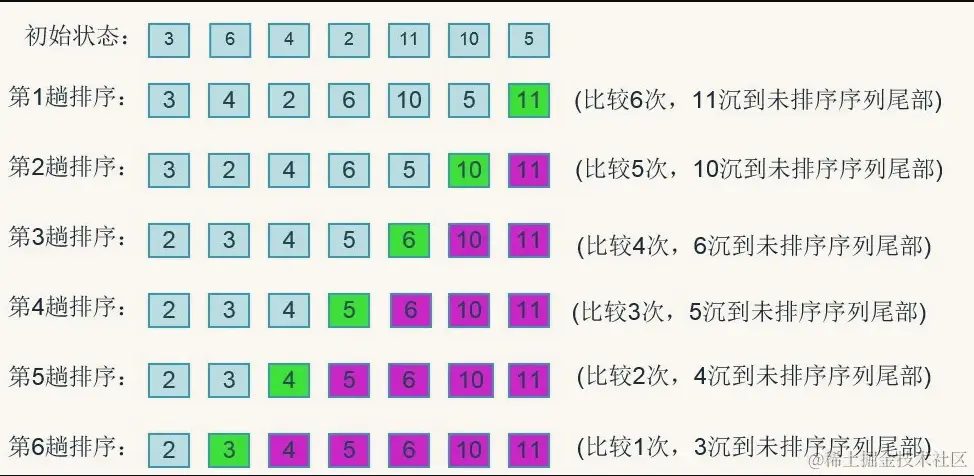 - 则第一次循环6次比较, 第二次5次比较, 第三次4次比较....直到最后一趟进行了一次比较