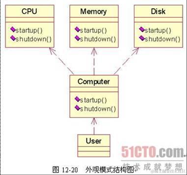 (4)外观模式类Computer.java 其中包含了CPU、内存和硬盘3个类对象,并定义了启动和关闭计算机的函数,在启动和关闭时批量地启动和关闭CPU、内存和硬盘。
