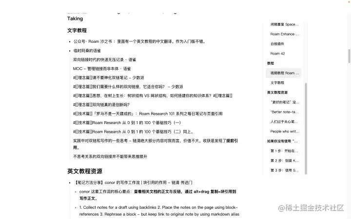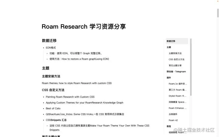 Roam 相关学习资源很多。对此,我整理了 Roam Research 社区相关的中英文文字教程、高质量的知识管理方法论文献、插件、主题等内容。