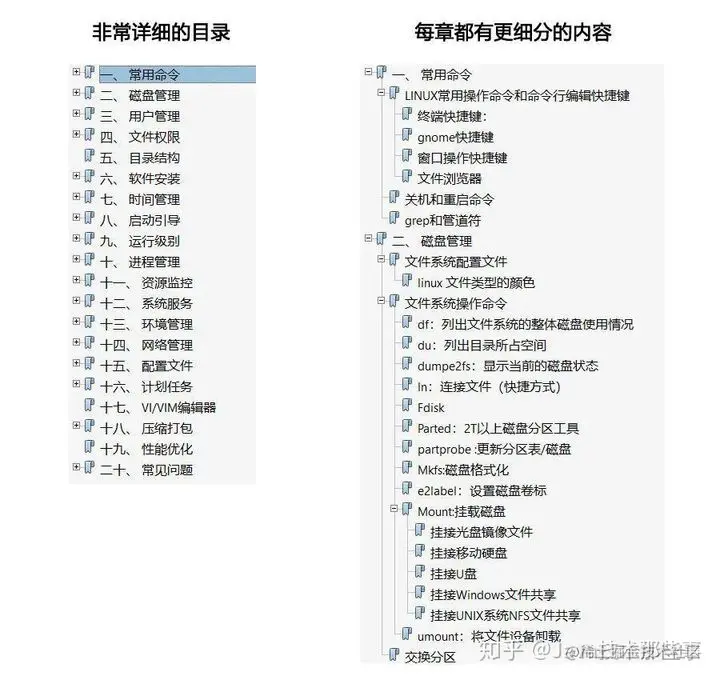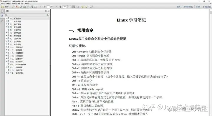 每个知识点都有左侧导航书签页,看的时候十分方便,由于内容较多,这里就截取一部分图吧。需要的读者朋友们找我就可以免费拿到这份 Linux速查手册!