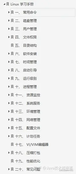 Linux学习手册涵盖内容:常用命令、磁盘管理、用户管理、文件权限、目录结构、软件安装、时间管理、启动引导、运行级别、进程管理、资源监控、系统服务、环境管理、网络管理、配置文件、计划任务、VI/VIM编辑器、压缩打包、性能优化、常见问题