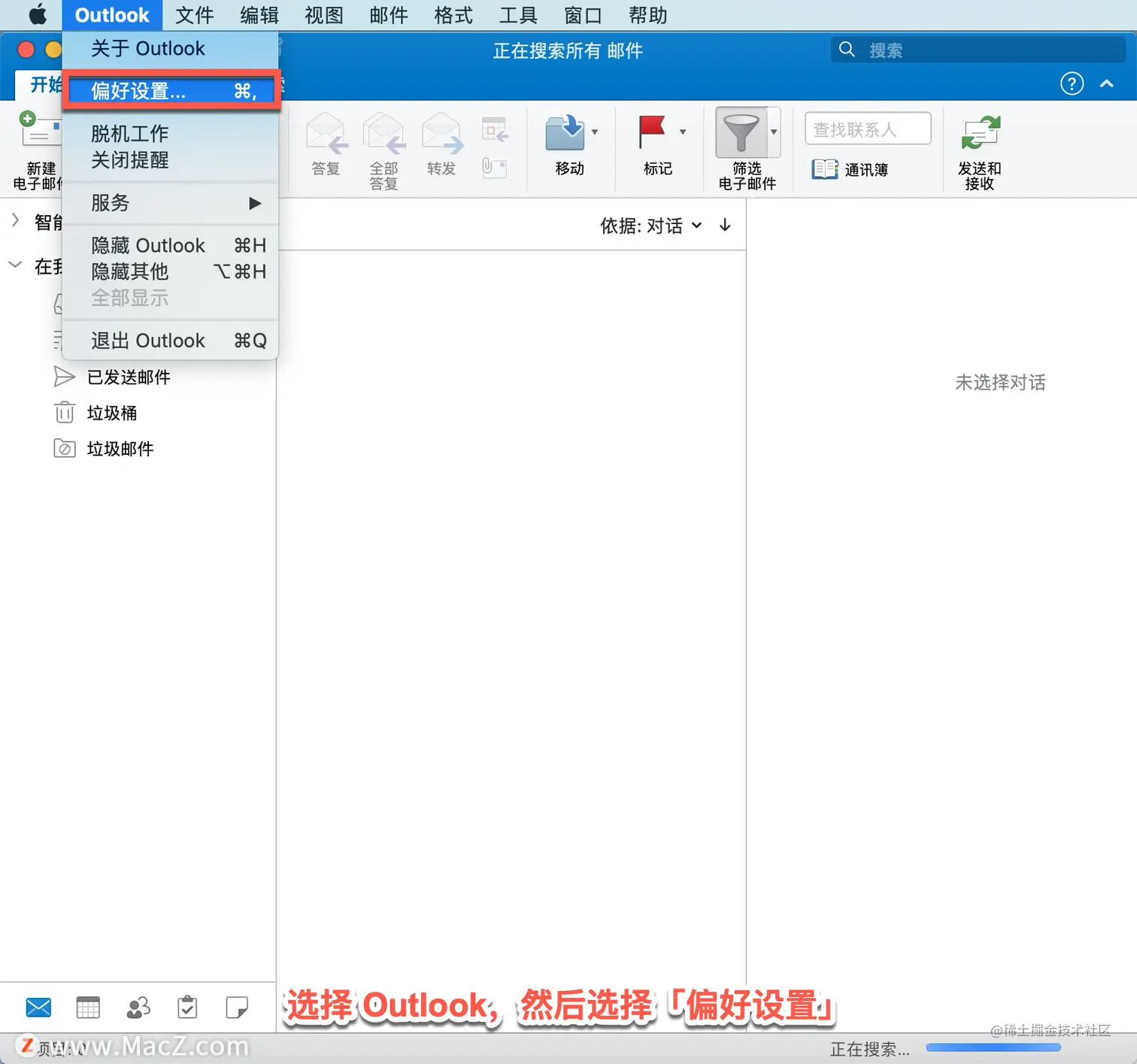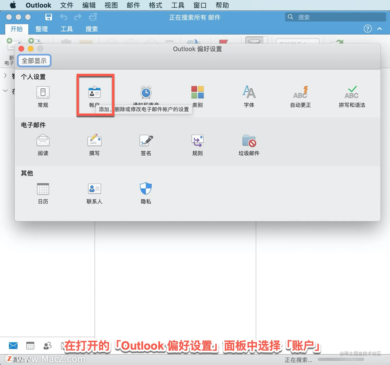 在打开的「Outlook 偏好设置」面板中选择「账户」。