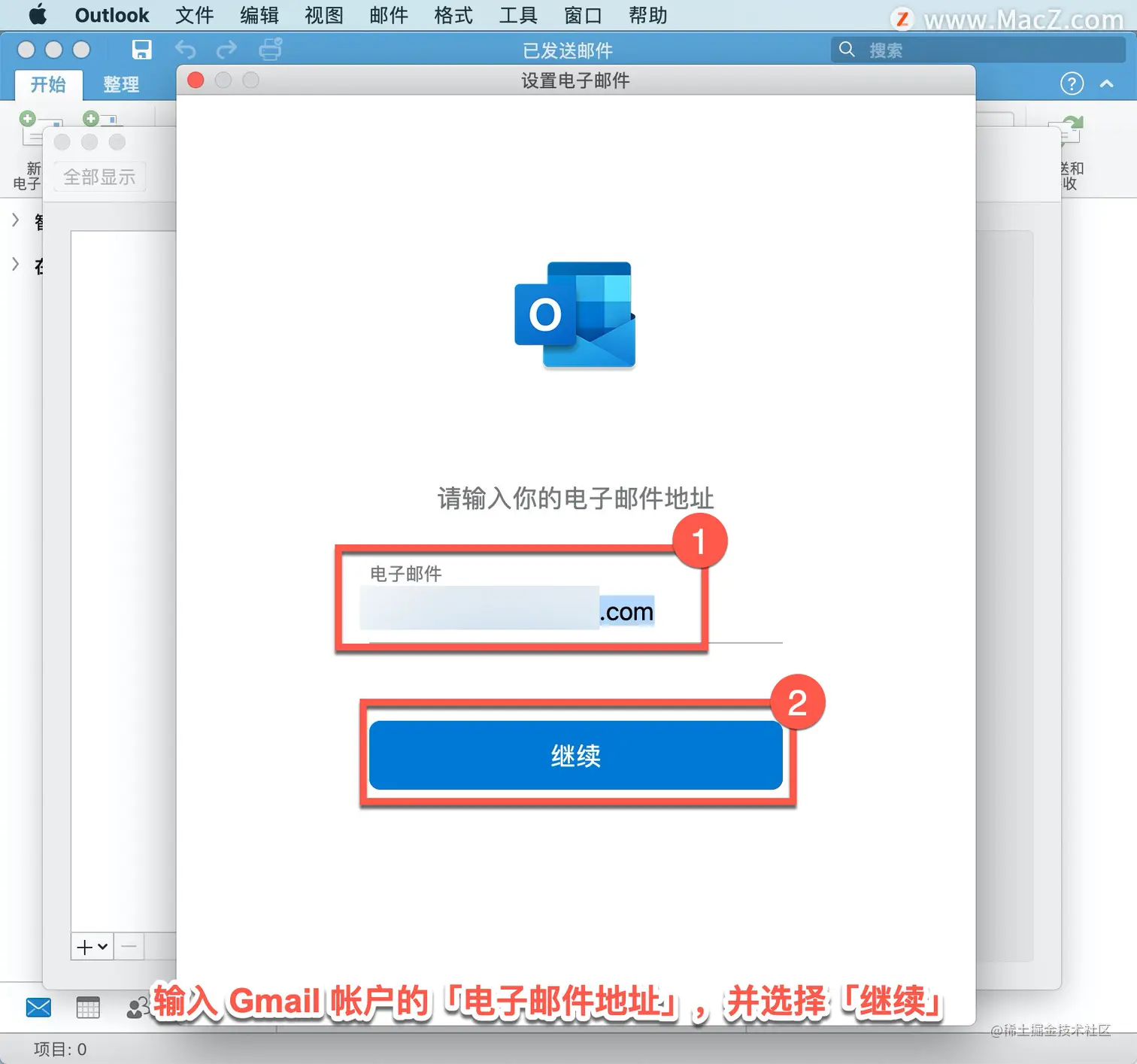 打开 Outlook,键入电子邮件地址,然后选择「继续」。